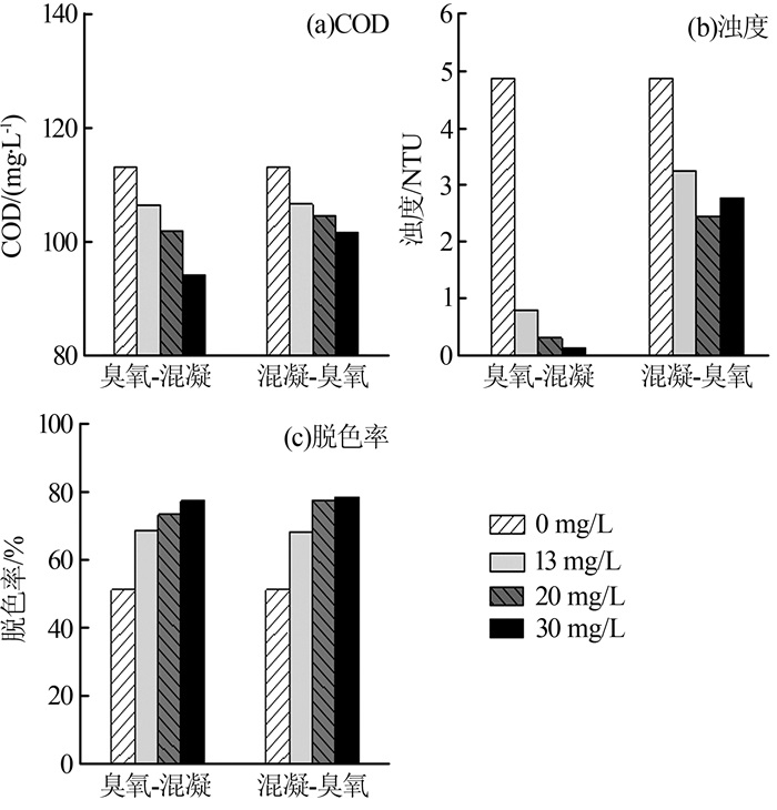 臭氧氧化的强化效率受其投加顺序影响,即臭氧-混凝对COD和浊度的强化去除效率优于混凝-臭氧。当臭氧投加量为30 mg/L时,臭氧-混凝和混凝-臭氧可将混凝出水COD(106.4 mg/L)分别降低至94.2、101.6 mg/L;将混凝出水浊度(4.9 NTU)分别降低至0.1、2.8 NTU;将混凝出水脱色率(51.4%)分别提升至77.7%、78.8%。臭氧-混凝工艺对色度、浊度、COD的去除率为70%、95%、21%,比单独混凝工艺分别提高了17%、15%、5%。臭氧-混凝强化出水浊度去除效率,主要是由于臭氧的微絮凝作用可以使水中的微粒凝集成絮体,增加后续混凝效率,降低出水浊度。