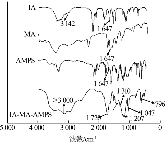 由图1可知,IA在3 142 cm-1处为羧基的O—H伸缩振动吸收峰;IA、MA、AMPS均在1 647 cm-1处有明显的峰,为C=C的伸缩振动吸收峰;由于IA-MA-AMPS具有强烈的吸水性,因此在>3 000 cm-1处为其—OH的伸缩振动峰,1 720 cm-1处为酰胺的C=O伸缩振动吸收峰,1 310 cm-1处是C—H伸缩振动吸收峰,1 207 cm-1处为S=O伸缩振动吸收峰,1 047 cm-1处为S—O的伸缩振动吸收峰,796 cm-1处为C—S的伸缩振动吸收峰。通过红外光谱图对比发现IA-MA-AMPS并未出现C=C的伸缩振动吸收峰,再结合文献〔5〕的实验结果表明已合成了IA-MA-AMPS三元共聚物。