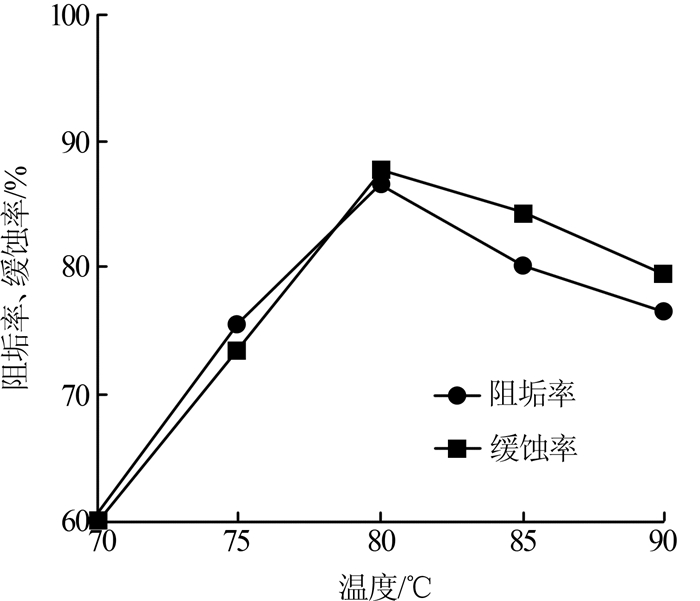 在n(IA):n(MA):n(AMPS)=1:1:1,反应时间为40 min,引发剂投加量为单体总质量5%的条件下,考察反应温度对阻垢和缓蚀性能的影响,结果见图4。