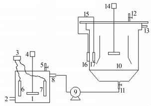| 图1 电解-MFC装置示意 1—电解池本体;2—电解池进水口;3—可调电源;4—搅拌机;5—排气口;6—石墨电极;7—不锈钢电极;8—出水口;9—蠕动泵;10—MFC本体;11—进水口;12—排气口;13—MFC出水口;14—搅拌机;15—导线;16—空气阴极;17—碳毡阳极。 |