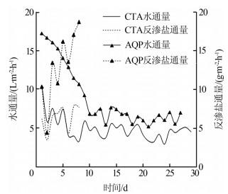 (1)30 d的运行结果表明,AQP膜水通量大于CTA膜,溶质反渗作用更严重。AQP膜和CTA膜的起始(第1天)水通量分别为17.24、10.60 L/(m2·h),在第30天分别下降到6.83、4.53 L/(m2·h);起始反渗盐通量分别为10.34、6.23 g/(m2·h),分别上升到18.72、7.72 g/(m2·h)后趋于稳定。
