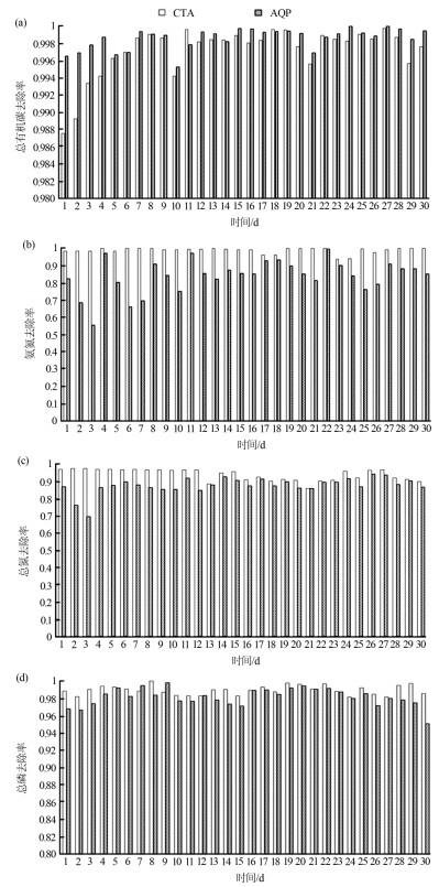 由图3(b)可知,CTA组氨氮去除率比AQP组高,去除效果较为稳定。整个运行周期30 d内均保持在93%以上,最高可达99.9%,出水氨氮最高为0.53 mg/L。AQP组氨氮去除效果相对较差,氨氮去除率变化较大,最小为55.3%,最大为99.5%,出水氨氮平均质量浓度为3.8 mg/L。