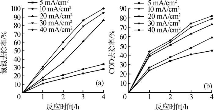 由图3可知,当电流密度>10 mA/cm2时,氨氮、COD去除率随电流密度的增加而显著增大。电流密度分别为10、20、30 mA/cm2时,反应4 h,氨氮去除率分别为34%、86%、95%,COD去除率分别为59%、73%、79%,即当电流密度由10 mA/cm2升至20 mA/cm2时,污染物去除率提升最大,去除效率最高。这是因为低电流密度下,难降解有机物氧化不充分,容易在电极表面生成聚合物膜,使得电极活性表面减少,降低了氧化效率〔5〕;当电流密度增大时,电极的极化作用增强,电极电势增高,产生更多的强氧化性活性物质,提升了氧化效率。但同时阳极吸氧副反应、热损耗也会随着电流密度的增加而有所加大,电极使用寿命则会随着电流密度的增加而显著降低。综合考虑,电流密度取20 mA/cm2为宜。