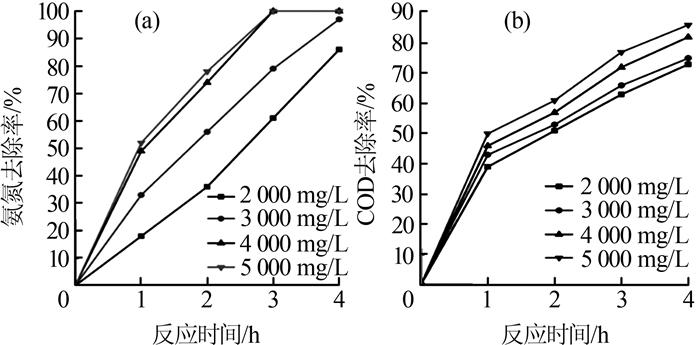 同时发现,当氯离子质量浓度为4 000 mg/L时,氨氮去除率在反应3 h时即达到100%,此时COD去除率为72%。而继续延长反应时间仅对COD的去除有少量提升,而且也达不到相关排放限值。因此,从节约能耗与提升反应效率考虑,反应时间取3 h为宜。