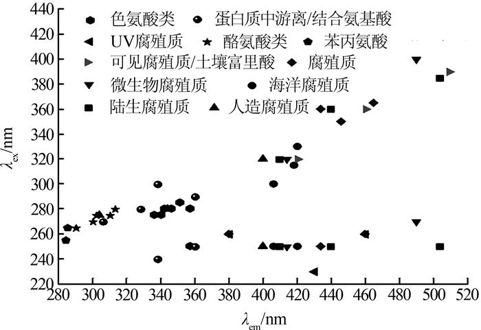 ... DOM作为一种复杂的混合物,它的三维荧光光谱图也比较复杂,一般将激发波长小于380 nm的荧光峰视为类蛋白,激发波长大于380 nm的荧光峰视为类腐殖酸〔18〕.不同激发/发射波长(λex/λem)对应的DOM的结果见图1〔27-35〕. ...