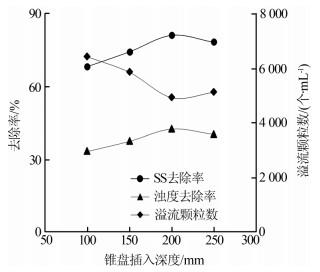 由图5可知,当锥盘插入深度从100 mm增加到200 mm时,SS去除率由68.4%增大到81.8%,浊度去除率由33.4%提升到42.6%,溢流颗粒数由6 435个/mL减小到4 936个/mL;当锥盘插入深度从200 mm增加到250 mm时,SS和浊度去除率降低,溢流颗粒数增大。