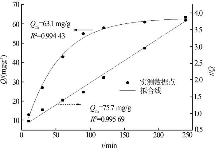 将一定量的ZS浸泡在硫酸铜水溶液中,进行吸附动力学实验。保持铜离子初始质量浓度200 mg/L,考察吸附时间与吸附量的关系。对所得数据使用Origin中的BoxLucas(准一级)方程进行非线性拟合;再使用t/Q对t作图,进行准二级方程线性拟合,结果见图4。