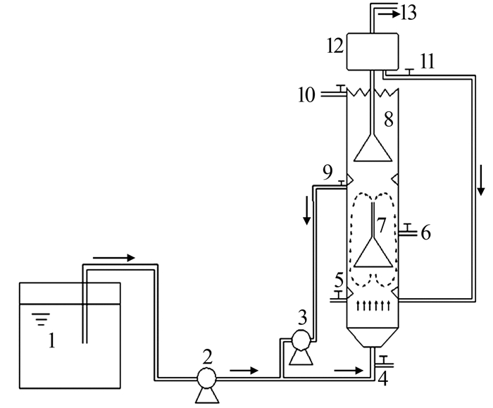 | 图1 实验装置 1—配水桶;2—进水泵;3—外循环泵;4、5、6—取样口;7、8—内循环装置;9—外循环管;10—出水口;11—回流管;12—气液分离室;13—沼气出口。 |