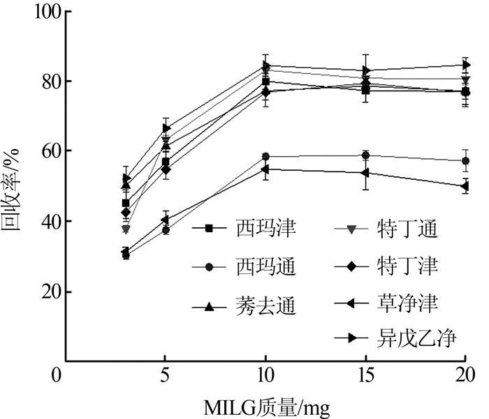 MILG包含离子液体咪唑环和石墨烯芳香环的π-π共轭体系,其可与三嗪类除草剂的均三氮芳香杂环的p-π体系形成分子间的静电作用力,进而实现对目标物的快速吸附。三嗪类除草剂的杂环体系带有氨基取代基,作为供电子基团可增加目标物p-π体系的电子云密度,进而提高其与MILG的分子间作用力。因此本实验在中性条件下,按1.2.2中的步骤考察了MILG的用量(3~20 mg)对萃取效果的影响,萃取时间为20 min,结果如图3所示。