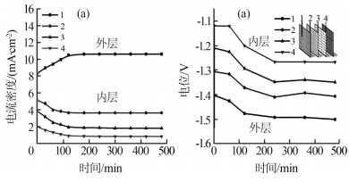| 图5 复合网状阴极各层网的电流密度(a)及电位(b)随时间变化曲线 |
