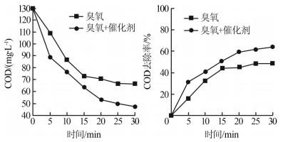 该园区废水主要来自生产针织布、梭织布的纺织印染企业,由退浆废水、煮炼废水、漂白废水、丝光废水、染色废水、印花废水、漂洗废水等组成,COD≤2 000 mg/L、BOD5≤600 mg/L、pH≤11、SS≤600 mg/L、色度为300~400倍、水温≤40 ℃。该废水可生化性较差,B/C在0.3以下,经物化+生化处理后,二沉池出水COD在130 mg/L左右,无法达到提标排放要求,需增加深度处理环节。采用臭氧氧化和催化臭氧氧化方法对二沉池出水水样进行处理,pH为8.5、催化剂投加量为1 g/L,臭氧流量为100 mL/min,臭氧质量浓度为50 mg/L,处理效果如图6所示。