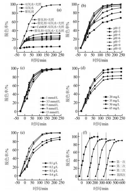 将150 mL一定浓度的RhB溶液置于反应器中,加入Fe2O3@Cu-MOF纳米复合材料,用H2SO4和NaOH溶液调节pH。将混合好的溶液用磁力搅拌器搅拌,在无光条件下吸附30 min,待溶液达到物理吸附平衡后再加入过氧化氢。溶液在可见光照射下,用低温冷却液循环泵通入循环水以控制温度,开启电源后,参考电流和参考光强稳定后的时刻记为起点,分别在15、30、60、120、150、180、240 min时取样,取上清液并用紫外-可见分光光度计在554 nm处测定各样品的吸光度,计算脱色率。