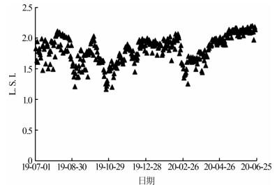 根据循环水场的水质及系统特点,日常运行中控制循环水Langelier饱和指数L.S.I处于结垢趋势(见图2),通过无磷水处理方案的缓蚀、阻垢、分散性能,达到良好的控制系统腐蚀和结垢要求。