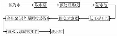 原海水由取水泵输送至预处理系统,去除悬浮固体、胶体、藻类、微生物、油脂等,以满足海水反渗透装置的进水要求,根据进水水质可选用絮凝反应沉淀池、气浮、过滤、超滤等装置进行相应处理。预处理合格的产水储存至预处理产水池(清水池),然后由低压提升泵输送至保安过滤器,经高压泵加压后进入海水反渗透膜组进行脱盐,生产淡水。