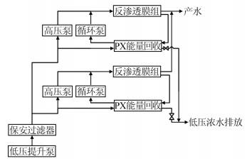 图2为采用PX能量回收装置的海水反渗透单元流程。