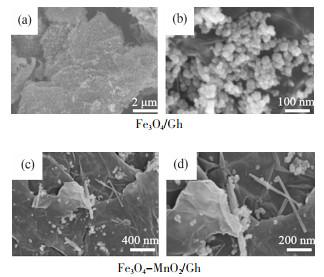 由图 3可知,Fe3O4/Gh和Fe3O4-MnO2/Gh都具有明显的层状结构,而且层间距较大;由图 3(a)和图 3(b)可知,Fe3O4/Gh中的球型Fe3O4较均匀地分布在石墨烯表面和片层间,阻止了石墨烯片层之间的团聚,但球型的Fe3O4自身在石墨烯的表面出现较严重的团聚现象;由图 3(c)和图 3(d)可知,Fe3O4-MnO2/Gh中的球型Fe3O4和棒状MnO2均匀地分布并紧密接触在石墨烯的表面和片层间,这种结构有利于电子在石墨烯层间的传输〔6〕。添加MnO2纳米棒之后的复合材料Fe3O4-MnO2/Gh石墨烯片层上的Fe3O4粒子和MnO2均匀分散,未出现团聚现象,Fe3O4粒子的直径约为20~30 nm,棒状MnO2的直径约为20~40 nm,这与XRD谱图的结果是一致的。