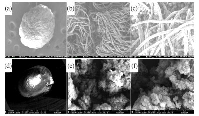| 图4 颗粒污泥的SEM 丝状菌颗粒污泥表面(a:×50倍,b:×2 000倍,c:×5 000倍) 好氧颗粒污泥表面(a:×110倍,b:×5 000倍,c:×1 0000倍) |