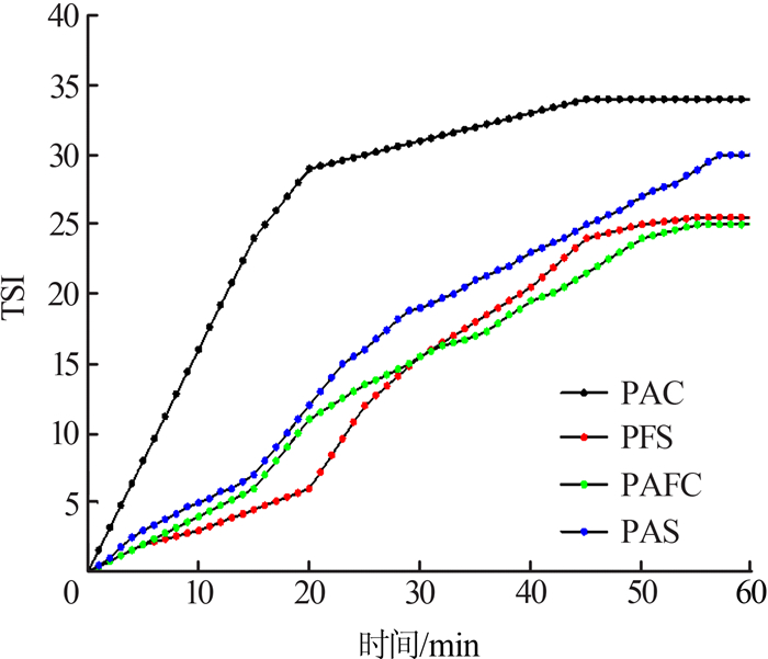 | 图4 不同凝聚剂下TSI值随时间变化的曲线 |