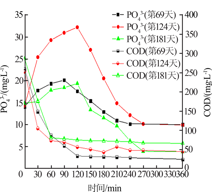 | 图3 系统典型周期PO43-浓度及COD随时间的变化 |