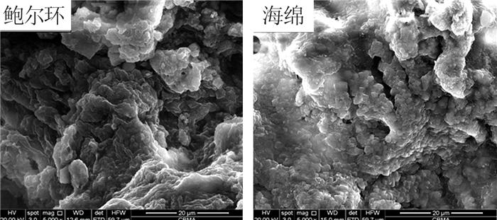 在第20天短程硝化稳定期,取出C组试验中投加的鲍尔环填料和海绵填料进行SEM分析,结果如图 5所示。