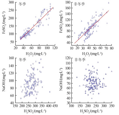 | 图4 H2O2与FeSO4、H2SO4和NaOH两组参数相关性分析 |
