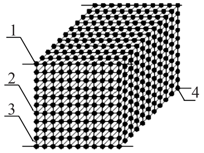 | 图1 多级串联粒子电极组 1—接电源正极球形粒子电极;2—感应式球形粒子电极;3—定位绝缘尼龙丝线;4—接电源负极球形粒子电极。 |