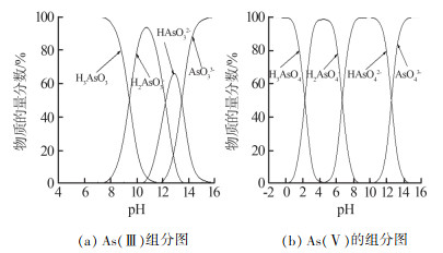 | 图1 As(Ⅲ)及As(Ⅴ)组分比例与pH的关系 (a)As(Ⅲ)组分图(b)As(Ⅴ)的组分图 |