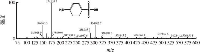 在25 ℃、pH为6.0、SDZ初始质量浓度为20 mg/L的实验条件下,对SDZ降解后的溶液进行Q-TOF分析,研究SDZ的降解机理,结果如图 5所示。保留时间为3.527 min处出现1个主峰,检测到该物质为SDZ(m/z=250),随后峰强度迅速降低,峰完全消失。