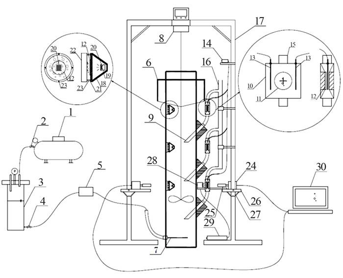 1—气泵;2—进气阀;3—溶气罐;4—出水阀;5—气浮控制器;6—柱状气浮池;7—释气针;8—程控式搅拌器;9—取液管;10—微电泳池;11—高透玻璃窗;12—目镜测微尺;13—电极;14—电泳电源控制器;15—出水管;16—连通管;17—支架;18—灯箱;19—电池;20—LED灯板;21—磨砂玻璃;22—高透玻璃;23—固定螺栓;24—动态相机;25—微距镜头;26—相机云台;27—相机支架;28—LED平行光束灯;29—LED功率调节器;30—计算机。