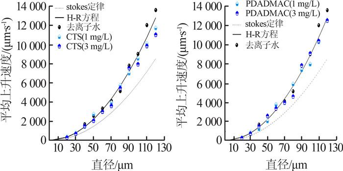 从图 6可见,CTS改性后微气泡的上升速度随微气泡尺寸的增加逐渐升高,但低于未改性微气泡的上升速度及H-R方程得到的理论预测值,且该现象随CTS质量浓度的升高越来越显著。与未改性微气泡相比,PDADMAC改性微气泡的上升速度差别较小,随着PDADMAC质量浓度的升高未发生显著变化。J. J. Quinn等〔15〕发现气泡的上升速度随着无机盐浓度的增加而不断降低,其形状也逐渐接近球形,且气泡形状的变化与其上升速度有关,与溶质类型无关。因此,试验结果表明溶气水中有较多CTS分子处于游离状态,且CTS使用液中含有的冰乙酸使溶气水中的离子浓度升高,溶气水黏度受二者共同作用而增大,微气泡的上升速度因此受到微弱影响。