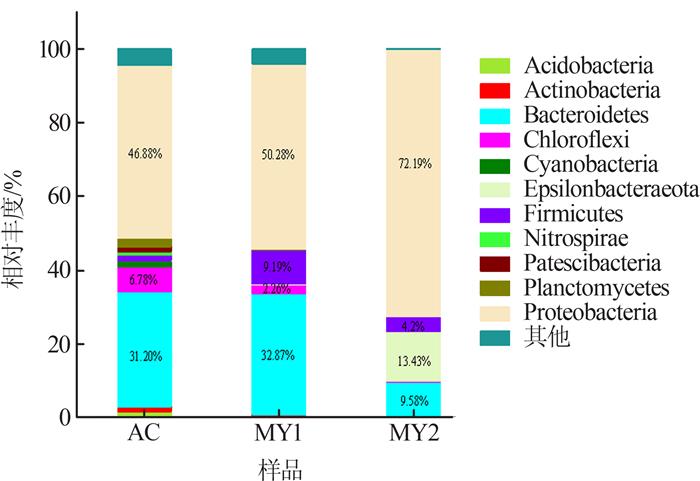 此外,绿弯菌门(Chloroflexi)在AC和MY1中的丰度为6.78%、2.26%,在MY2中的丰度仅为0.13%,这是因为Chloroflexi为厌氧生物,阳极电解水产生的O2 抑制了Chloroflexi的生长和繁殖。Epsilonbacteraeota在MY2中的丰度为13.43%,在AC和MY1中的丰度<1%,Epsilonbacteraeota为之前的ε-变形菌纲[17 ] ,后被划分为新门,可利用H2 作为电子供体,阳极产生H2 是其丰度较高的主要原因。
