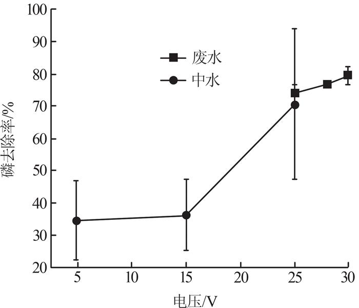 在正交试验条件下,考察电压对中水和废水的磷去除率的影响,结果如图 3所示。