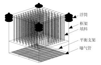 由于目前大部分原位修复技术仅仅停留在水体浅层,而对原位去除水下不同深度的污染物则研究较少。郭炜超等〔23〕集成创新并发明了一种包含“矿物材料+底泥+微生物+沉水植物”等众多原位处理技术的生态介质箱,用于处理劣Ⅴ类河道污染水体,经63 d的试验,水体中的TN、NH4+-N、TP、CODMn的去除率分别达到78.8%、93.8%、67.3%、89.3%,均优于传统浮床,是一种值得推广的综合技术。季亦强等〔24〕利用集超微孔软管曝气技术(RSH)和生物处理技术(AOS)于一体的装置,原位修复黑臭水体,其对COD、NH4+-N的去除率分别为79.23%、87.51%,水体透明度由4 cm提高到30 cm,出水水质达到Ⅴ类水标准,AOS生物反应器内部结构示意见图 2。