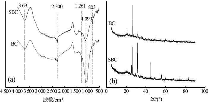 通过对BC和SBC 2种生物炭的比表面积和孔隙分析得出:添加硫酸钙后的SBC总孔容和BC相差不大,但比表面积和平均孔径却相差较大,比表面积从53.444 m2/g减小至19.429 m2/g,平均孔径从6.857 nm增大到13.857 nm。原因可能在于添加的硫酸钙颗粒堵塞了生物炭的部分孔隙结构,造成比表面积减小,从而使平均孔径增大。