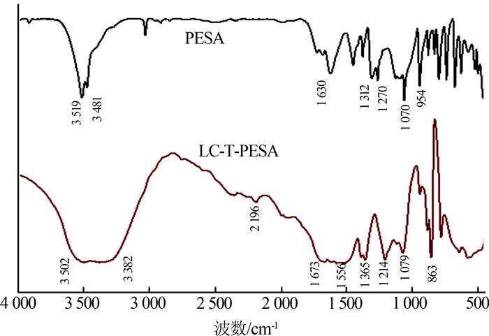 由图 1可知,PESA的FTIR中,1 070 cm-1处的环氧键断裂形成的醚键和1 312 cm-1与1 630 cm-1所代表的羧基符合其分子结构;LC-T-PESA的FTIR中,3 382 cm-1处表示酰胺基中N—H的伸缩振动,而1 556 cm-1处则对应着—N—H面内弯曲振动,1 673 cm-1处为—CONH—中—C=O—的伸缩振动,证明氨基与PESA上的羧基反应生成酰胺基,接枝反应成功;1 214 cm-1处的特征峰对应磺酸基中—S=O的不对称伸缩振动,说明三元共聚物分子结构中存在磺酸基,牛磺酸成功接枝到PESA的分子链上;1 079 cm-1为—C—O—C—的伸缩振动。由此可见,制得的PESA衍生物所含化学基团主要包括羧基、酰胺基、磺酸基,说明改性成功。