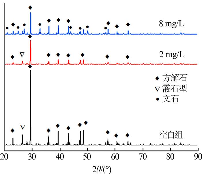 碳酸钙在自然界中的天然晶体以方解石和霰石型为主。由图 5可知,空白组的XRD显示垢样在2θ衍射角的主要晶面衍射峰都属于典型方解石晶型,而方解石作为碳酸钙晶体所有晶型中热力学和动力学最稳定的晶型,在无外界干扰的情况下主要沿斜六方体(104)晶面生长,所以(104)晶面对应的晶型衍射峰强度最强;观察LC-T-PESA投加量为2 mg/L的实验组垢样发现,在2θ=26.48°〔(111)晶面〕出现文石的晶型衍射峰,而在2θ=29.37°处的(104)晶面衍射峰强度减弱,这说明方解石的稳定性遭到破坏,垢样为方解石和文石共存;观察LC-T-PESA投加量为8 mg/L的实验组发现:(104)晶面的衍射峰强度更弱,其他方解石的特征衍射峰强度也有所减弱,另外还增加了霰石的晶型衍射峰。这说明在LC-T-PESA作用下,方解石的衍射峰强度随LC-T-PESA投加量的增加而减弱,出现了文石和霰石的衍射峰且增强,碳酸钙垢的晶型发生改变,由稳定的方解石晶型转化为了不稳定的方解石和霰石的混合晶型。