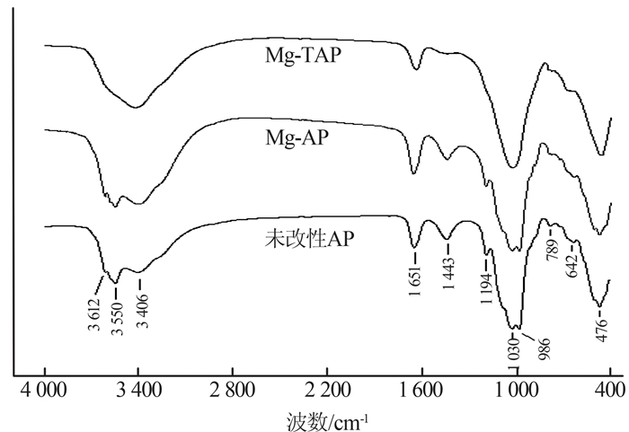 | 图2 AP、Mg-AP和Mg-TAP的FTIR表征结果 |