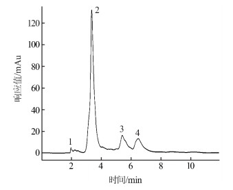 | 图1 母液样品色谱分析结果 1—未知物;2—2-氨基-4-乙酰氨基苯甲醚;3—对乙酰氨基苯甲醚;4—2-硝基-4-乙酰氨基苯甲醚。 |