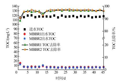 2.1 2种不同生物膜载体MBBR对TOC的去除效果