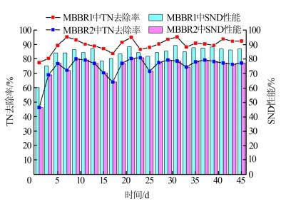 图 3为2种不同生物膜载体MBBR对TN的去除效果及对SND性能的影响。