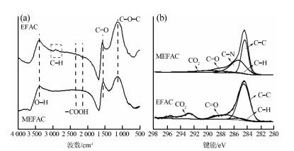 吸附MB前后的EFAC的FTIR及其C1s的XPS表征结果如图 7所示。