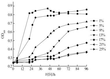 由图 2、图 3可知,在1%和5%盐度下,菌株数小时后便进入对数生长期,24 h左右已进入稳定生长期。相对应的是9%和13%盐度下的菌株经历20 h适应期后才进入对数生长期,而适应期的延长并未影响菌株活性,经历96 h生长后,菌株在13%盐度下的生物增加量高达172%,COD去除率高达77.1%,充分说明该菌株具有很高的适应能力和耐盐特性。17%~25%盐度下菌株的适应期相对更长,但生物量仍呈缓慢增长趋势,最终对苯酚仍有50%的去除效果。由图 3还可知菌株降解苯酚效率最高的盐度区间为5%~13%,反映出菌株的嗜盐特性。在1%盐度下,反应中期其生物量最大则可能是该普通盐溶液混入了大气中常规微生物。