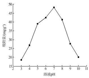 溶液pH会影响PP-g-(AA-MAH)纤维表面的性质和苯胺在水中的存在形态,进而影响吸附效果。图 2为在25 ℃、吸附时间90 min、苯胺初始质量浓度300 mg/L时,pH对PP-g-(AA-MAH)纤维吸附量的影响。pH在3~10范围内纤维对苯胺的吸附量先增大后减小,当溶液为中性时,吸附量最大,为48.3 mg/g。