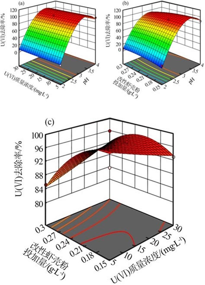 由图 2(c)可知,改性虾壳粉投加量与U(Ⅵ)溶液浓度对U(Ⅵ)的去除率交互作用不显著,当U(Ⅵ)溶液浓度不变时,增加改性虾壳粉的投加量,U(Ⅵ)的去除率先升高后降低,在改性虾壳粉投加量为0.2 g/L时达到峰值,这与本实验投加量对改性虾壳粉吸附U(Ⅵ)的影响结果一致。