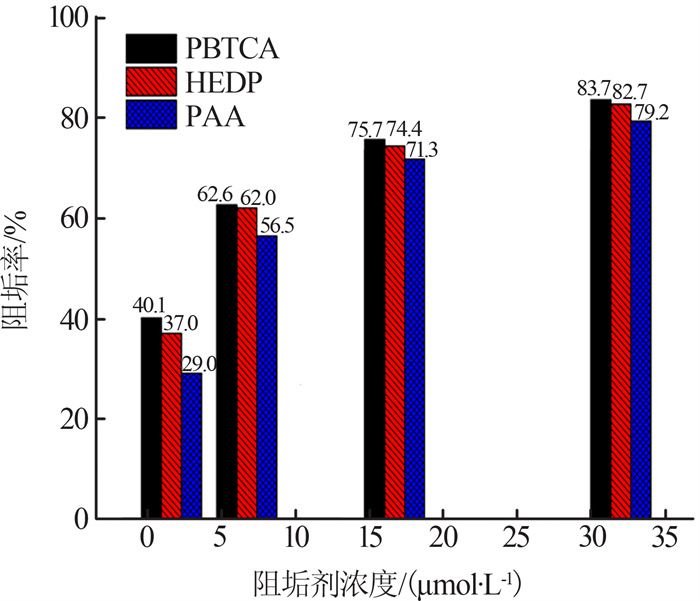 | 图4 PBTCA、HEDP和PAA在不同浓度时的阻垢率 |