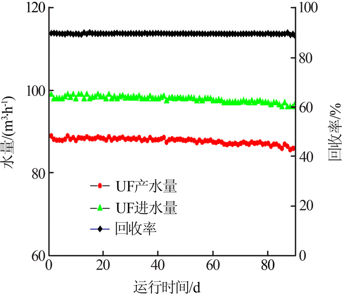 | 图3 UF进水量、产水量和回收率随运行时间的变化情况 |