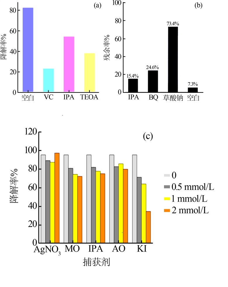 | 图3 不同抑制剂添加后对四环素降解的影响 注:MO的4组质量分数分别为0、0.1%、1%、2%。 |