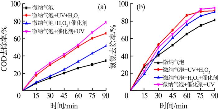 多耦合方式的氨氮去除率进一步提升,UV+H2O2和催化剂+UV方式下,氨氮甚至在75 min内达到较高去除率,证实多耦合方式对臭氧微纳气泡技术的显著强化作用。