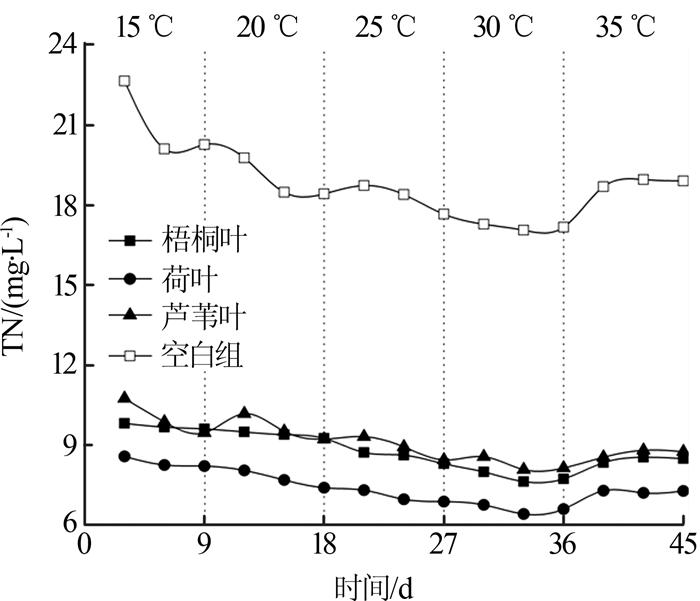 由图 6可知,设计进水TN为28~32 mg/L,平均温度在15~30 ℃时,脱氮效率均较高。温度升高可提高反硝化细菌的活性与湿地植物的生物活性,进而提高TN的去除率。投加植物碳源试验组的TN去除率为64.1%~75.7%。远高于空白组(24.5%~37%)。但平均温度为35 ℃时,出水TN升高,是由于温度升高限制了微生物和湿地植物的生理活性。