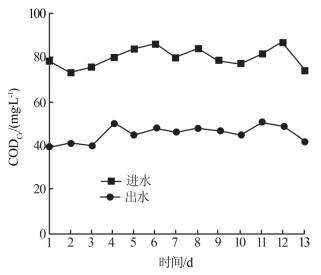 厌氧水解工艺可将一部分高级氧化出水中的大分子有机物分解为小分子有机物,有利于后续好氧微生物的降解。厌氧水解酸化段的进水CODCr在118~141 mg/L,平均值为125 mg/L;出水CODCr为74~87 mg/L,平均值为80 mg/L,COD去除率平均为36%,如图 2所示。